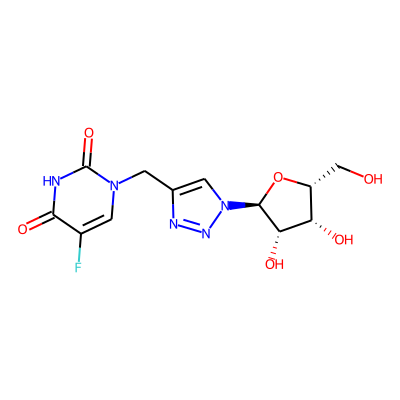 GD037641 | -3.07 | 343.27 | C12H14O6N5F | O=c1[nH]c(=O)n(Cc2cn([C@H]3O[C@H](CO)[C@H](O)[C@@H]3O)nn2)cc1F |