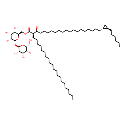 GD037642 | 12.19 | 1071.61 | C62H118O13 | CCCCCCCCCCCCCCCCCCCCC[C@@H](C(=O)OC[C@H]1O[C@H](O[C@H]2O[C@H](CO)[C@H](O)[C@H](O)[C@@H]2O)[C@H](O)[C@H](O)[C@@H]1O)[C@@H](O)CCCCCCCCCCCCCCCCC[C@@H]1C[C@H]1CCCCCC |
