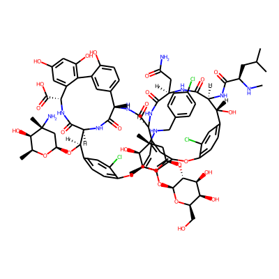 CNC(CC(C)C)C(=O)NC1C(=O)NC(CC(N)=O)C(=O)NC2C(=O)NC3C(=O)NC(C(=O)NC(C(=O)O)c4cc(O)cc(O)c4-c4cc3ccc4O)C(OC3CC(C)(N)C(O)C(C)O3)c3ccc(c(Cl)c3)Oc3cc2cc(c3O)Oc2ccc(cc2Cl)C1O| HBA: | 28 | RingCount: | 11 |