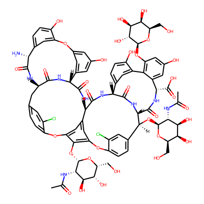 NC1C(=O)NC2Cc3ccc(c(Cl)c3)Oc3cc4cc(c3O)Oc3ccc(cc3Cl)C(O)C3NC(=O)C(NC(=O)C4NC(=O)C(NC2=O)c2cc(O)cc(c2)Oc2cc1ccc2O)c1ccc(O)c(c1)-c1c(O)cc(O)cc1C(C(=O)O)NC3=O| HBA: | 25 | RingCount: | 13 |