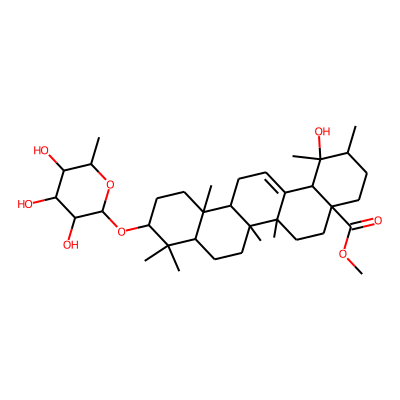 COC(=O)C12CCC(C)C(C)(O)C1C1=CCC3C4(C)CCC(O)C(C)(C)C4CCC3(C)C1(C)CC2| HBA: | 4 | RingCount: | 5 |