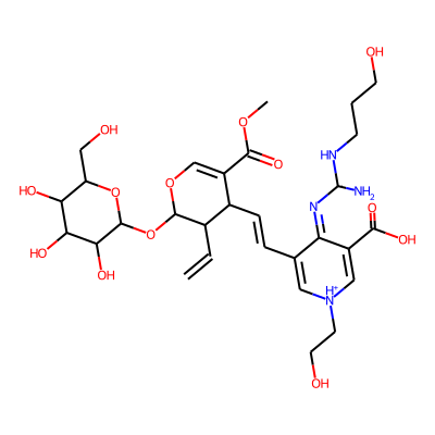 C=CC1C(O)OC=C(C(=O)OC)C1C=CC1=C[NH+](CCO)C=C(C(=O)O)C1=NC(N)NCCCO| HBA: | 12 | RingCount: | 2 |