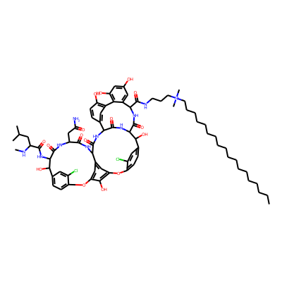 CCCCCCCCCCCCCCCCCC[N+](C)(C)CCCNC(=O)C1NC(=O)C2NC(=O)C(NC(=O)C3NC(=O)C(CC(N)=O)NC(=O)C(NC(=O)C(CC(C)C)NC)C(O)c4ccc(c(Cl)c4)Oc4cc3cc(c4O)Oc3ccc(cc3Cl)C2O)c2ccc(O)c(c2)-c2c(O)cc(O)cc21| HBA: | 26 | RingCount: | 10 |