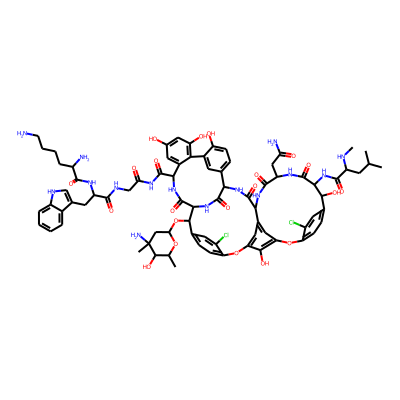 CNC(CC(C)C)C(=O)NC1C(=O)NC(CC(N)=O)C(=O)NC2C(=O)NC3C(=O)NC(C(=O)NC(C(=O)NC(=O)CNC(=O)C(Cc4c[nH]c5ccccc45)NC(=O)C(N)CCCCN)c4cc(O)cc(O)c4-c4cc3ccc4O)C(OC3CC(C)(N)C(O)C(C)O3)c3ccc(c(Cl)c3)Oc3cc2cc(c3O)Oc2ccc(cc2Cl)C1O| HBA: | 36 | RingCount: | 13 |