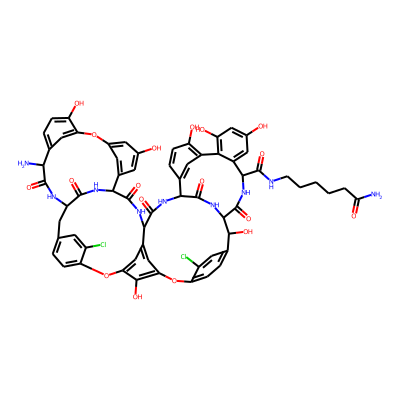 NC(=O)CCCCCNC(=O)C1NC(=O)C2NC(=O)C(NC(=O)C3NC(=O)C4NC(=O)C(Cc5ccc(c(Cl)c5)Oc5cc3cc(c5O)Oc3ccc(cc3Cl)C2O)NC(=O)C(N)c2ccc(O)c(c2)Oc2cc(O)cc4c2)c2ccc(O)c(c2)-c2c(O)cc(O)cc21| HBA: | 27 | RingCount: | 13 |