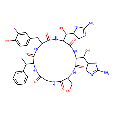 CC(c1ccccc1)C1NC(=O)CNC(=O)C(CO)NC(=O)C(C(O)C2CN=C(N)N2)NC(=O)C(C(O)C2CN=C(N)N2)NC(=O)C(Cc2ccc(O)c(I)c2)NC1=O| HBA: | 22 | RingCount: | 5 |