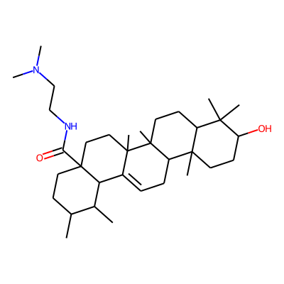 CC1CCC2(C(=O)NCCN(C)C)CCC3(C)C(=CCC4C5(C)CCC(O)C(C)(C)C5CCC43C)C2C1C| HBA: | 4 | RingCount: | 5 |