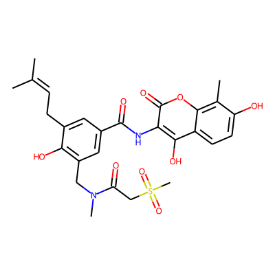 CC(C)=CCc1cc(C(=O)Nc2c(O)c3ccc(O)c(C)c3oc2=O)cc(CN(C)C(=O)CS(C)(=O)=O)c1O| HBA: | 11 | RingCount: | 3 |