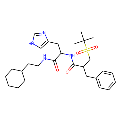CC(C)(C)S(=O)(=O)CC(Cc1ccccc1)C(=O)NC(Cc1c[nH]cn1)C(=O)NCCC1CCCCC1| HBA: | 8 | RingCount: | 3 |