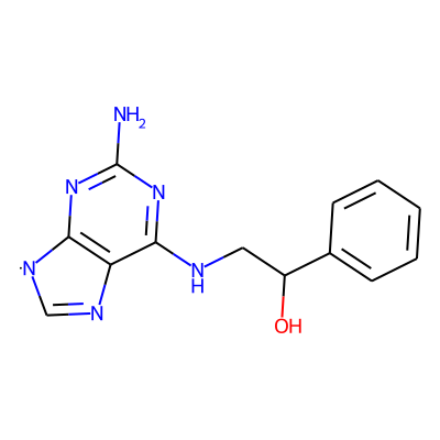 Nc1nc2c(c(NCC(O)c3ccccc3)n1)N=C[N]2| HBA: | 7 | RingCount: | 3 |