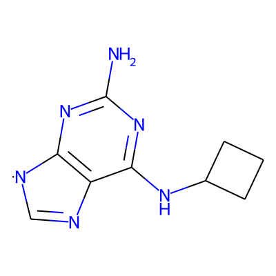 Nc1nc2c(c(NC3CCC3)n1)N=C[N]2| HBA: | 6 | RingCount: | 3 |
