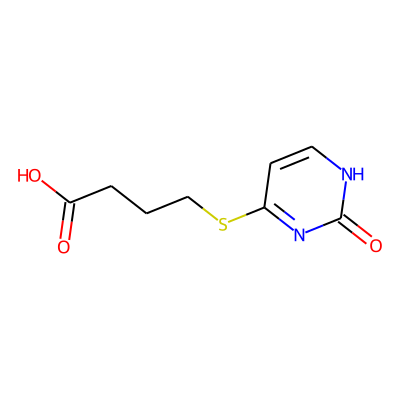 O=C(O)CCCSc1cc[nH]c(=O)n1| HBA: | 5 | RingCount: | 1 |