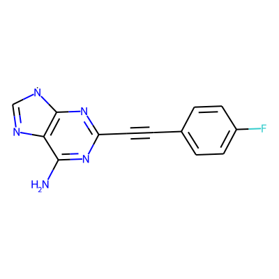Nc1nc(C#Cc2ccc(F)cc2)nc2c1N=C[N]2| HBA: | 5 | RingCount: | 3 |
