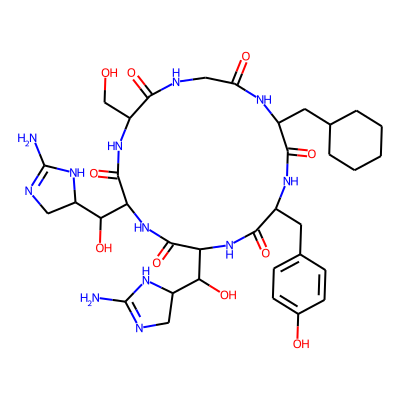 NC1=NCC(C(O)C2NC(=O)C(Cc3ccc(O)cc3)NC(=O)C(CC3CCCCC3)NC(=O)CNC(=O)C(CO)NC(=O)C(C(O)C3CN=C(N)N3)NC2=O)N1| HBA: | 22 | RingCount: | 5 |
