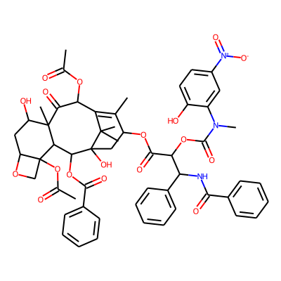 CC(=O)OC1C(=O)C2(C)C(O)CC3OCC3(OC(C)=O)C2C(OC(=O)c2ccccc2)C2(O)CC(OC(=O)C(OC(=O)N(C)c3cc([N+](=O)[O-])ccc3O)C(NC(=O)c3ccccc3)c3ccccc3)C(C)=C1C2(C)C| HBA: | 21 | RingCount: | 8 |