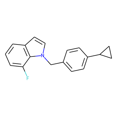Fc1cccc2ccn(Cc3ccc(C4CC4)cc3)c12| HBA: | 1 | RingCount: | 4 |