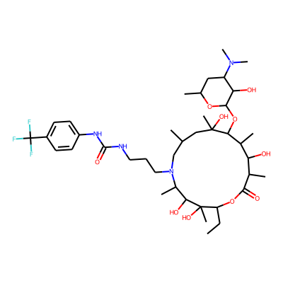 CCC1OC(=O)C(C)C(O)C(C)C(OC2OC(C)CC(N(C)C)C2O)C(C)(O)CC(C)CN(CCCNC(=O)Nc2ccc(C(F)(F)F)cc2)C(C)C(O)C1(C)O| HBA: | 14 | RingCount: | 3 |
