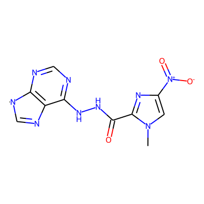 Cn1cc([N+](=O)[O-])nc1C(=O)NNc1ncnc2c1N=C[N]2| HBA: | 12 | RingCount: | 3 |