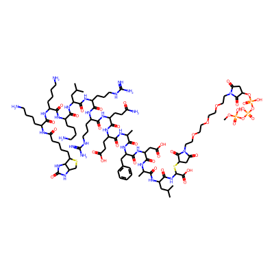 CC(C)C[C@H](NC(=O)[C@H](C)NC(=O)[C@H](CC(=O)O)NC(=O)C(Cc1ccccc1)NC(=O)[C@H](C)NC(=O)[C@H](CCC(=O)O)NC(=O)[C@H](CCC(N)=O)NC(=O)[C@H](CCCNC(=N)N)NC(=O)[C@H](CCCNC(=N)N)NC(=O)[C@H](CC(C)C)NC(=O)[C@H](CCCCN)NC(=O)[C@H](CCCCN)NC(=O)[C@H](CCCCN)NC(=O)CCCC[C@@H]1SC[C@@H]2NC(=O)N[C@H]12)C(=O)N[C@H](SC1CC(=O)N(CCOCCOCCOCCN2C(=O)CC(OP(=O)(O)OP(=O)(O)OP(=O)(O)OC[C@@H]3O[C@H](n4cnc5c(N)ncnc54)[C@H](O)[C@H]3O)C2=O)C1=O)C(=O)OAglycone: