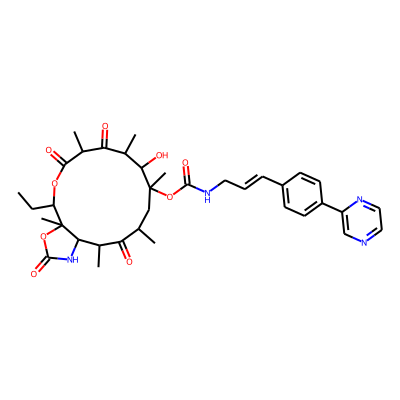 CCC1OC(=O)C(C)C(=O)C(C)C(O)C(C)(OC(=O)NCC=Cc2ccc(-c3cnccn3)cc2)CC(C)C(=O)C(C)C2NC(=O)OC12C| HBA: | 13 | RingCount: | 4 |