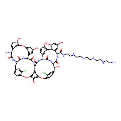 NCCNCCNCCNCCNCCNC(=O)C1NC(=O)C2NC(=O)C(NC(=O)C3NC(=O)C4NC(=O)C(Cc5ccc(c(Cl)c5)Oc5cc3cc(c5O)Oc3ccc(cc3Cl)C2O)NC(=O)C(N)c2ccc(O)c(c2)Oc2cc(O)cc4c2)c2ccc(O)c(c2)-c2c(O)cc(O)cc21| HBA: | 30 | RingCount: | 13 |