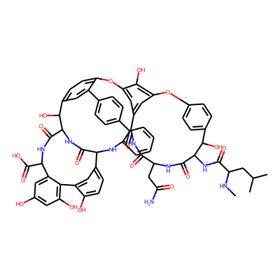 CNC(CC(C)C)C(=O)NC1C(=O)NC(CC(N)=O)C(=O)NC2C(=O)NC3C(=O)NC(C(=O)NC(C(=O)O)c4cc(O)cc(O)c4-c4cc3ccc4O)C(O)c3ccc(c(-c4ccc(-c5ccccc5)cc4)c3)Oc3cc2cc(c3O)Oc2ccc(cc2)C1O| HBA: | 25 | RingCount: | 12 |
