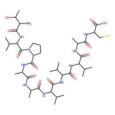 CC(NC(=O)C(C)NC(=O)C1CCCN1C(=O)C(NC(=O)C(N)C(C)O)C(C)C)C(=O)NC(C(=O)NC(C(=O)NC(C(=O)NC(C)C(=O)NC(CS)C(=O)O)C(C)C)C(C)C)C(C)C| HBA: | 22 | RingCount: | 1 |