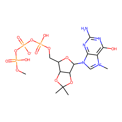 COP(=O)(O)OP(=O)([O-])OP(=O)(O)OCC1OC(n2c[n+](C)c3c(O)nc(N)nc32)C2OC(C)(C)OC12| HBA: | 19 | RingCount: | 4 |