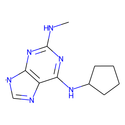 CNc1nc2c(c(NC3CCCC3)n1)N=C[N]2| HBA: | 6 | RingCount: | 3 |