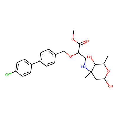 COC(=O)C(CNC1(C)CC(O)OC(C)C1O)OCc1ccc(-c2ccc(Cl)cc2)cc1| HBA: | 7 | RingCount: | 3 |