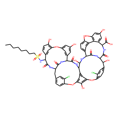 CCCCCCCCS(=O)(=O)NC1C(=O)NC2Cc3ccc(c(Cl)c3)Oc3cc4cc(c3O)Oc3ccc(cc3Cl)C(O)C3NC(=O)C(NC(O)C4NC(=O)C(NC2=O)c2cc(O)cc(c2)Oc2cc1ccc2O)c1ccc(O)c(c1)-c1c(O)cc(O)cc1C(C(=O)O)NC3=O| HBA: | 27 | RingCount: | 13 |