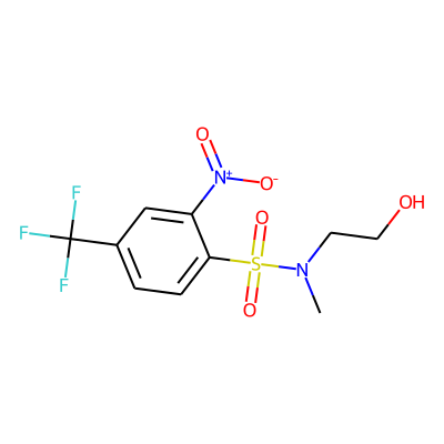 CN(CCO)S(=O)(=O)c1ccc(C(F)(F)F)cc1[N+](=O)[O-]| HBA: | 7 | RingCount: | 1 |