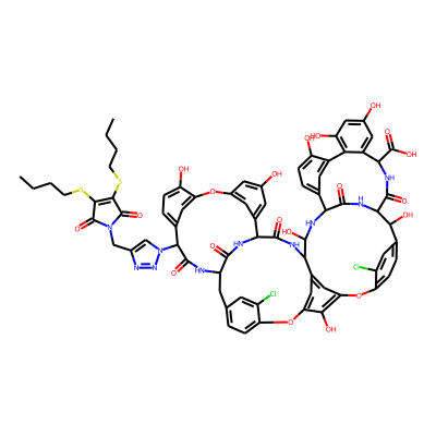 CCCCSC1=C(SCCCC)C(=O)N(Cc2cn(C3C(=O)NC4Cc5ccc(c(Cl)c5)Oc5cc6cc(c5O)Oc5ccc(cc5Cl)C(O)C5NC(=O)C(NC(O)C6NC(=O)C(NC4=O)c4cc(O)cc(c4)Oc4cc3ccc4O)c3ccc(O)c(c3)-c3c(O)cc(O)cc3C(C(=O)O)NC5=O)nn2)C1=O| HBA: | 30 | RingCount: | 15 |
