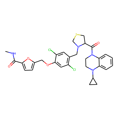 CNC(=O)c1ccc(COc2cc(Cl)c(CN3CSCC3C(=O)N3CCN(C4CC4)c4ccccc43)cc2Cl)o1| HBA: | 8 | RingCount: | 6 |