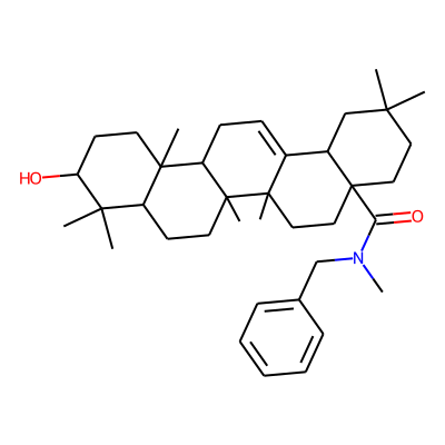 CN(Cc1ccccc1)C(=O)C12CCC(C)(C)CC1C1=CCC3C4(C)CCC(O)C(C)(C)C4CCC3(C)C1(C)CC2| HBA: | 3 | RingCount: | 6 |