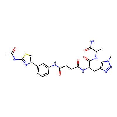 CC(=O)Nc1nc(-c2cccc(NC(=O)CCC(=O)NC(Cc3cn(C)nn3)C(=O)NC(C)C(N)=O)c2)cs1| HBA: | 14 | RingCount: | 3 |