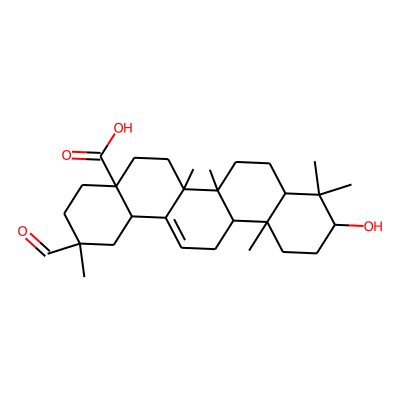 CC1(C=O)CCC2(C(=O)O)CCC3(C)C(=CCC4C5(C)CCC(O)C(C)(C)C5CCC43C)C2C1| HBA: | 4 | RingCount: | 5 |