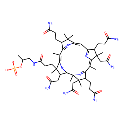 CC1=C2N=C(C=C3N=C(C(C)=C4[N-]C(C(CC(N)=O)C4(C)CCC(=O)NCC(C)OP(=O)([O-])O)C4(C)N=C1C(CCC(N)=O)C4(C)CC(N)=O)C(CCC(N)=O)C3(C)C)C(CCC(N)=O)C2(C)CC(N)=O| HBA: | 22 | RingCount: | 5 |