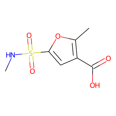 CNS(=O)(=O)c1cc(C(=O)O)c(C)o1| HBA: | 6 | RingCount: | 1 |