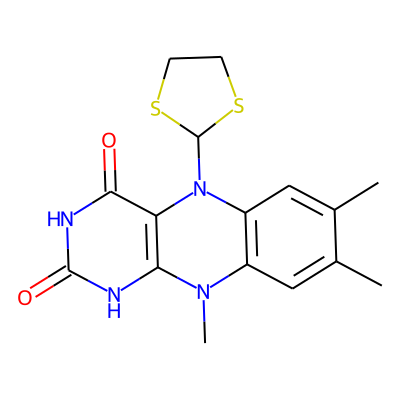 Cc1cc2c(cc1C)N(C1SCCS1)c1c([nH]c(=O)[nH]c1=O)N2C| HBA: | 6 | RingCount: | 4 |