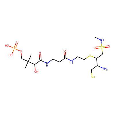 CNS(=O)(=O)CC(SCCNC(=O)CCNC(=O)C(O)C(C)(C)COP(=O)(O)O)C(N)CSHBA: | 13 | RingCount: | 0 |