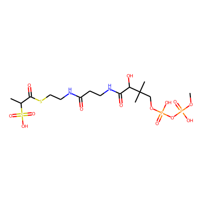 COP(=O)(O)OP(=O)(O)OCC(C)(C)C(O)C(=O)NCCC(=O)NCCSC(=O)C(C)S(=O)(=O)OHBA: | 16 | RingCount: | 0 |
