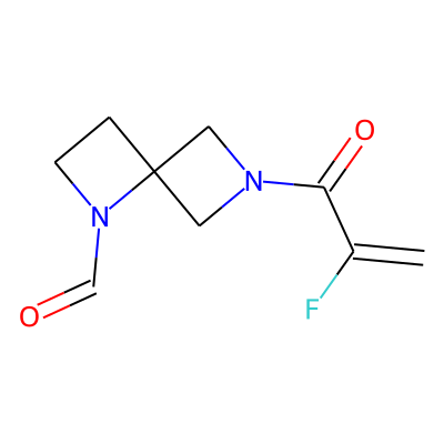 C=C(F)C(=O)N1CC2(CCN2C=O)C1| HBA: | 4 | RingCount: | 2 |