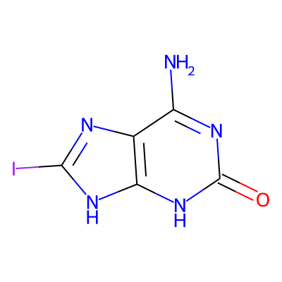 Nc1nc(=O)[nH]c2[nH]c(I)nc12HBA: | 6 | RingCount: | 2 |
