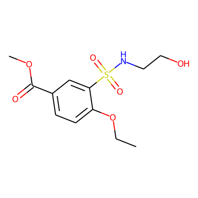 CCOc1ccc(C(=O)OC)cc1S(=O)(=O)NCCOHBA: | 7 | RingCount: | 1 |