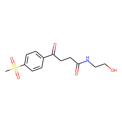 CS(=O)(=O)c1ccc(C(=O)CCC(=O)NCCO)cc1HBA: | 6 | RingCount: | 1 |