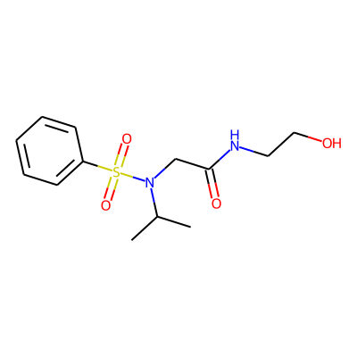 CC(C)N(CC(=O)NCCO)S(=O)(=O)c1ccccc1HBA: | 6 | RingCount: | 1 |