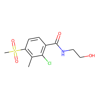 Cc1c(S(C)(=O)=O)ccc(C(=O)NCCO)c1ClHBA: | 5 | RingCount: | 1 |