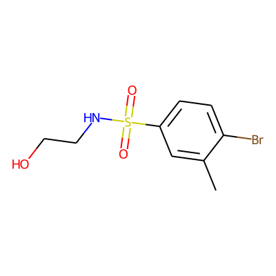 Cc1cc(S(=O)(=O)NCCO)ccc1BrHBA: | 4 | RingCount: | 1 |