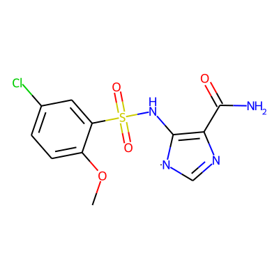 COc1ccc(Cl)cc1S(=O)(=O)NC1=C(C(N)=O)N=C[N]1| HBA: | 8 | RingCount: | 2 |